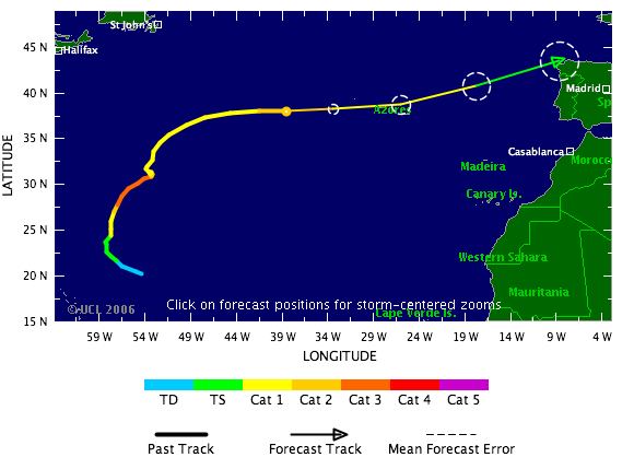 En cuanto a las predicciones, no podemos descartar nada, desde que nos afecte como tormenta tropical (opción cada vez menos probable), hasta que se forme muy cerca de Galicia una ciclogénesis, con una baja relativa inferior a 960 hPa, algo similar a lo que sucedió en 1941 (Santander 200 km/h, SS 190 Km/h...) aunque a escala más reducida.